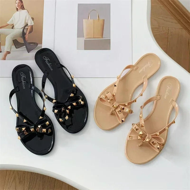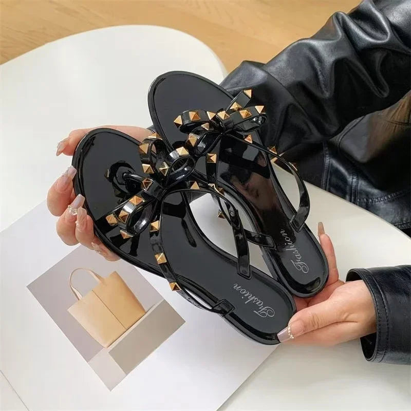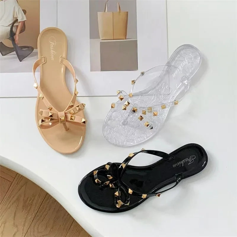2025 Summer Women Slippers Bow Flip Flops Rivet Flats Sandals Outdoor Transparent Crystal Beach Shoes Female Open Toe Shoes