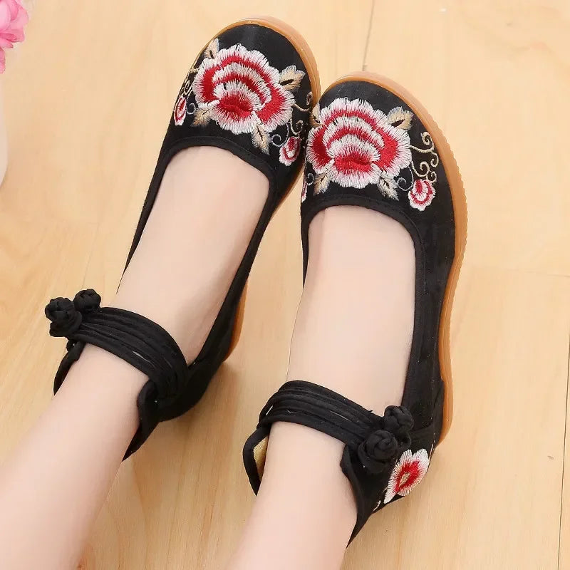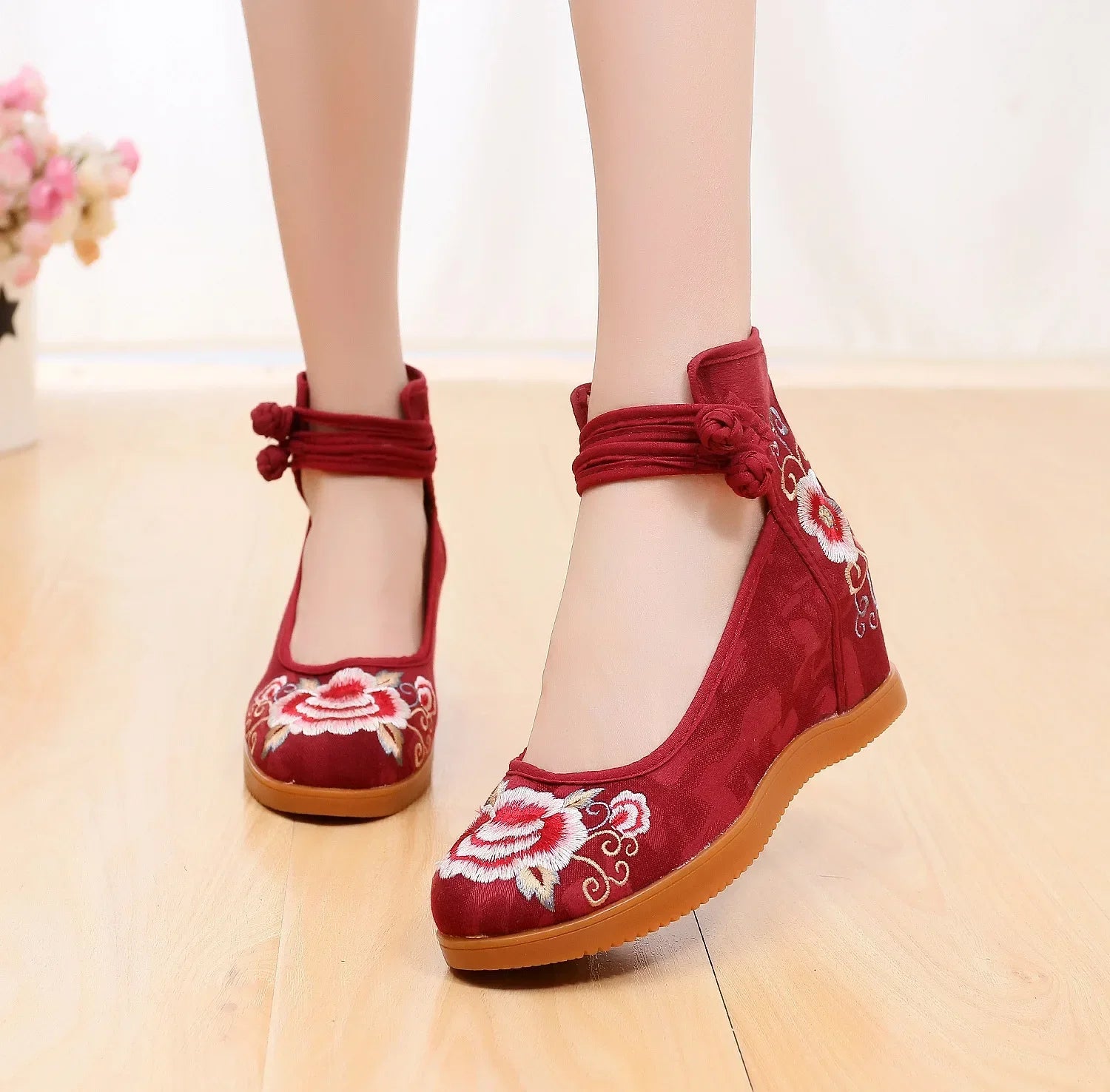 Chinese Style Women Canvas Hidden Platform Shoes Flower Embroidered Vintage Ladies Casual Ankle Strap Shoes kjm89