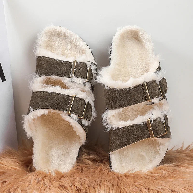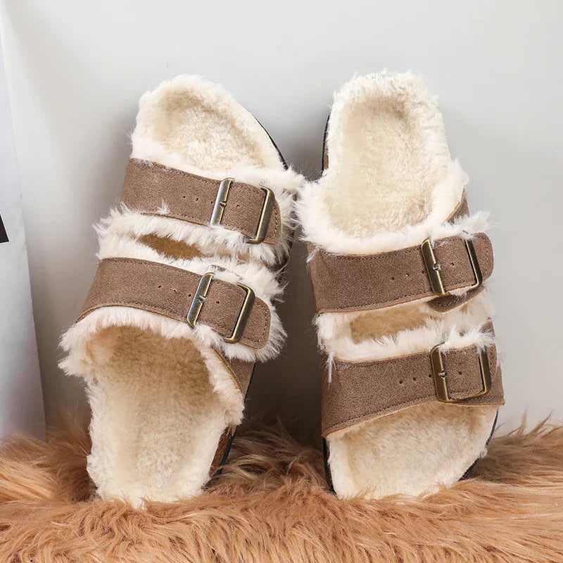 Men Women Plush Fur Slippers with Double Buckle Cork Sandals Winter Supper Warm Home Shoes Barefoot Comfort Footbed Sales